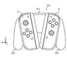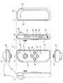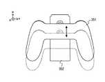 第1ゲームコントローラは、正面と、当該正面に対する側面であって第1レール部材が設けられる第1側面と、当該第1側面の反対側の第2側面と、当該正面の反対側の裏面とを有してもよい。第2側面と裏面との接続部分は、丸みを帯びた曲面で形成されてもよい。本体部は、第1面と、第2面と、第3面とを有してもよい。第1面は、第1レール部材が第1スライド部材に対して係合された第1ゲームコントローラの第2側面に沿って設けられる。第2面は、第1面に連続し、第1レール部材が第1スライド部材に対して係合された第1ゲームコントローラの接続部分の曲面に沿って設けられる。第3面は、第2面に連続し、第1レール部材が第1スライド部材に対して係合された第1ゲームコントローラの裏面に沿って設けられる。 The first game controller includes a front surface, a first side surface which is a side surface with respect to the front surface and provided with a first rail member, a second side surface opposite to the first side surface, and a back surface opposite to the front surface. You may have. The connecting portion between the second side surface and the back surface may be formed with a rounded curved surface. The main body may have a first surface, a second surface, and a third surface. The first surface is provided along a second side surface of the first game controller in which the first rail member is engaged with the first slide member. The second surface is continuous with the first surface, and is provided along the curved surface of the connection portion of the first game controller in which the first rail member is engaged with the first slide member. The third surface is continuous with the second surface, and is provided along the back surface of the first game controller in which the first rail member is engaged with the first slide member.