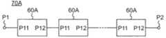 本発明の実施形態に係る非相反伝送線路装置の全体は、図9〜図12に示すように、図1〜図4の単位セル60A〜60Dを少なくとも1つ以上含みかつ縦続接続されて構成される。図9は、図1の単位セル60Aを縦続接続して構成された非相反伝送線路装置70Aの構成を示すブロック図である。図9において、ポートP1とポートP2との間に、複数個の単位セル60Aが縦続接続されることにより、非相反伝送線路装置70Aを構成している。図10は、図2の単位セル60Bを縦続接続して構成された非相反伝送線路装置70Bの構成を示すブロック図である。図10において、ポートP1とポートP2との間に、複数個の単位セル60Bが縦続接続されることにより、非相反伝送線路装置70Bを構成している。図11は、図3の単位セル60Cを縦続接続して構成された非相反伝送線路装置70Cの構成を示すブロック図である。図11において、ポートP1とポートP2との間に、複数個の単位セル60Cが縦続接続されることにより、非相反伝送線路装置70Cを構成している。図12は、図4の単位セル60Dを縦続接続して構成された非相反伝送線路装置70Dの構成を示すブロック図である。図12において、ポートP1とポートP2との間に、複数個の単位セル60Dが縦続接続されることにより、非相反伝送線路装置70Dを構成している。なお、複数個の単位セル60A〜60Dが縦続接続される場合においても、必ずしも単位セル60A〜60Dのうちの単一タイプのものを用いて構成される必要はなく、異なるタイプの単位セルを組み合わせて縦続接続してもよい。  The entire nonreciprocal transmission line device according to the embodiment of the present invention is configured to include at least one