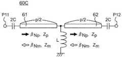 図1及び図2は、単位セル60A,60Bが非対称T型構造及び非対称π型構造をそれぞれ有する場合を示している。また、図3及び図4は、より単純な場合として、単位セル60C,60Dが対称T型構造及び対称π型構造をそれぞれ有する場合を示している。以下では原則として、単位セル60A〜60Dの線路長(つまり周期長さp=p1+p2)が波長に比べて十分小さい場合を仮定しているので、従来技術に係る右手/左手系複合伝送線路装置における伝送線路の単位セルの取り扱いと同様に、T型構造、π型構造あるいはL型構造の場合であっても、本質的に同様の結果が得られる。実際、L型構造は、パラメータ操作により図1又は図2の場合に含められる。なお、波長に対する単位セル60A〜60Dの線路長がここで述べる基本的動作を制約しないことを強調しておく。  1 and 2 show cases where the