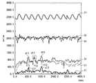 なお、図4では、符号A1,B1,C1を付した波形は、横軸を0秒〜4000ミリ秒の時間、縦軸を信号の強度として表示している。また、符号D1,E1,F1を付したスペクトルは、横軸を心拍数、縦軸をスペクトル強度(パワー)の対数表示として表示している。具体的には、表示されている横軸の数値を10で割った値が、スペクトルの横軸を表す心拍数(pulse/min)となる。また、表示されている縦軸の数字を10で割った値が、スペクトルの縦軸を表すデシベル値(dB)となる。ただし、スペクトルどうしの比較のために、スペクトルの位置を適宜縦方向にシフトして表示している。このため、各スペクトルにおいて、最大のポイントを0dBと読み替えるものとする。例えば、符号D1を付したスペクトルでは最大値が1000の所にあるため、800で−20dB、400で−60dBと読み替える。なお、スペクトルの横軸は、1分間あたり0〜400回の心拍数を表しているが、これを心拍の1秒毎の周波数として捉える場合には、0〜6.667Hzの周波数を表示しているといえる。これらのグラフの説明は、以降の図5〜図7についても同様である。 In FIG. 4, the waveforms denoted by reference signs A1, B1, and C1 are displayed with the horizontal axis representing the time from 0 second to 4000 milliseconds and the vertical axis representing the signal intensity. In addition, the spectra with the symbols D1, E1, and F1 are displayed as a logarithmic display of the heart rate on the horizontal axis and the spectral intensity (power) on the vertical axis. Specifically, a value obtained by dividing the displayed numerical value on the horizontal axis by 10 is the heart rate (pulse / min) representing the horizontal axis of the spectrum. Also, a value obtained by dividing the displayed number on the vertical axis by 10 is the decibel value (dB) representing the vertical axis of the spectrum. However, for comparison of spectra, the positions of the spectra are appropriately shifted in the vertical direction and displayed. For this reason, the maximum point in each spectrum is read as 0 dB. For example, since the maximum value is 1000 in the spectrum with the reference sign D1, 800 is read as -20 dB, and 400 is read as -60 dB. The horizontal axis of the spectrum represents a heart rate of 0 to 400 times per minute, but when this is regarded as a frequency per second of the heart beat, a frequency of 0 to 6.667 Hz is displayed. It can be said that. The explanation of these graphs is the same for the following FIGS.