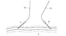 一方、上記の如く動脈側血液回路1aの先端部及び静脈側血液回路1bの先端部に陰圧又は陽圧を付与する作業と別に、図5、6に示すように、アクセス血管の上流側(動脈Aと静脈Bとの接合部であるシャント部C近傍)に動脈側穿刺針aを穿刺しつつ当該アクセス血管の下流側(シャント部C近傍より下流側の静脈B)に静脈側穿刺針bを穿刺しておく。かかる動脈側穿刺針a及び静脈側穿刺針bの患者に対する穿刺は、医療従事者による手作業にて行われる。  On the other hand, apart from the operation of applying negative pressure or positive pressure to the tip of the arterial blood circuit 1a and the tip of the