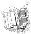 天板83の前端縁には、矩形平板状の側板84(以下、第1側板84と呼ぶ。)が下向きに垂れ下がるように形成されることが好ましい。第1側板84は、矩形の平板状に形成されることが好ましい。また、第1側板84は、図1及び図3に示すように、左右方向における中央部分に排気部840が設けられることが好ましい。この排気部840は、縦横に並べて設けられる多数の貫通孔8400で構成されることが好ましい。これら多数の貫通孔8400は、上下方向よりも左右方向に多く並ぶように設けられることが好ましい。すなわち、排気部840は、左右方向を長手方向とする長方形状の範囲内に設けられることが好ましい。  It is preferable that a rectangular flat plate-like side plate 84 (hereinafter referred to as a first side plate 84) be formed to hang downward at the front end edge of the
