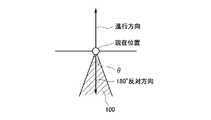 次に、ソート後の各臭い情報のうち自車両の現在位置や進行方向を基準として必要度の低い臭い情報を、臭い情報DB5から破棄する(S35)。具体的には、例えば、ソート後の各臭い情報のうち自車両の現在位置から所定距離以上離れた位置情報を有する臭い情報を必要度の低い臭い情報と判定し、破棄する。また、例えば、現在位置を基準として、S32で求めた進行方向と逆方向に位置する臭い情報を必要度の低い臭い情報と判定し、破棄しても良い。このとき、例えば、図7に示すように、進行方向の180°反対方向を中心とした所定角度θ(θは0°以上180°以下の角度)の範囲100(ハッチングの範囲)を、進行方向と逆方向と定義する。また、自車両から所定距離以上の位置にある臭い情報であっても、自車両の進行方向側に位置する臭い情報は破棄せずに残しても良いし、自車両から所定距離未満の位置にある臭い情報であっても、自車両の進行方向と逆方向に位置する臭い情報は破棄しても良い。さらに、進行方向と逆方向に位置する臭い情報であっても自車両に近い臭い情報(自車両から所定距離未満の臭い情報)は残しても良い。なお、S35の処理を実行するエアコンECU4が本発明の低必要度判定手段及び情報破棄手段に相当する。  Next, among the smell information after sorting, the smell information having a low degree of necessity with reference to the current position and the traveling direction of the vehicle is discarded from the smell information DB 5 (S35). Specifically, for example, among the pieces of odor information after sorting, the odor information having position information separated from the current position of the vehicle by a predetermined distance or more is determined as odor information having a low degree of necessity, and discarded. Also, for example, the odor information located in the direction opposite to the traveling direction obtained in S32 may be determined as odor information with a low degree of necessity, based on the current position, and discarded. At this time, for example, as shown in FIG. 7, the range 100 (the range of hatching) of the predetermined angle θ (θ is an angle of 0 ° to 180 °) centered on the 180 ° opposite direction of the traveling direction And defined as the opposite direction. Also, even if the odor information is at a predetermined distance or more from the host vehicle, the odor information located on the traveling direction side of the host vehicle may be left without being discarded, or at a position less than the predetermined distance from the host vehicle. Even if it is certain odor information, the odor information located in the opposite direction to the traveling direction of the host vehicle may be discarded. Furthermore, even if it is the odor information located in the opposite direction to the traveling direction, the odor information close to the vehicle (odor information less than a predetermined distance from the vehicle) may be left. The