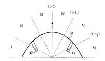 例えば、図4Aでは、衝突センサ42,43は、ロボットの前側部分を6つの領域(I〜VI)に分割可能である。1つの衝突センサが作動すると、ロボットは、他のセンサが作動するまでの(仮に作動するとして)時間を算定する。例えば、右側の衝突センサ43が作動すると、ロボットは、左側の衝突センサ42が作動するまでの時間(t)を測定する。tがt1未満であれば、ロボットは、接触が領域IVで発生したものとみなす。tがt1以上かつt2未満であれば、ロボットは、接触が領域Vで発生したものとみなす。tがt2以上(監視時間内に左側の衝突センサ42が全く作動しない場合を含む)であれば、ロボットは、接触が領域VIで発生したものとみなす。衝突センサが同時に作動した場合には、ロボットは、接触がまっすぐ前で発生したものとみなす。この方法は、使用される時間測定及びバンパの幾何学的形状次第で、バンパを任意の多数の領域に(より高精度で)分割するのに用いられてもよい。機能拡張として、上記の例のように2次元だけとする代わりに、3次元で衝突角度を算出するのに、3つのセンサを用いてもよい。For example, in FIG. 4A, the