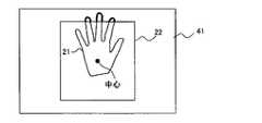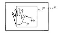 図13に示すように、赤外線画像の中心(赤外線カメラ4の撮像範囲の中心)よりも上側にユーザの手が存在する場合、ユーザの手の輪郭の一部がガイド枠画像22の上方にはみ出る。また、図14に示すように、赤外線画像の中心よりも左側にユーザの手が存在する場合、ユーザの手の輪郭の一部がガイド枠画像22の左方にはみ出る。これらはみ出た部分は、はみ出てない他の部分(例えば、黒色)とは異なる表示態様(例えば、赤色)で表示される。このような合成画像41が生成された後、これらの画像にパースがかけられディスプレイ2に表示される(図11及び図12に示すように合成画像41がパース表示される)。  As shown in FIG. 13, when the user's hand exists above the center of the infrared image (the center of the imaging range of the infrared camera 4), a part of the user's hand protrudes above the