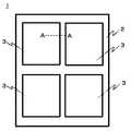 まず、図1に示す様に、CF基板1は、その表面が予め濡れ性(wettability)の低い領域2と、濡れ性の大きい領域3に区別されて作成される。すなわち本実施の形態では、CF基板1の表面を形成する際に、濡れ性の小さい領域2は、配向膜を塗布しない領域に対応して、また濡れ性の大きい領域3は、配向膜を塗布する領域に対応して形成される。なお、ここで言う基板表面の「濡れ性」とは、配向膜材料に対する「濡れ性」の大/小(良い/悪い)を意味する。<Configuration of CF substrate>