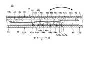 第1支持部材42は、第1筐体部材12Aの内面側で該内面に沿って筐体部材12A,12B間に亘るX方向にスライド可能に設けられる。第1支持部材42は、その長手方向で両端部の表面にそれぞれ押さえ面42aを有する。押さえ面42aは、第1支持部材42の他の表面よりも一段低い面である。第1支持部材42は、長手方向で一対の押さえ面42a,42a間となる部分の表面にX方向の溝部42bを複数有する。第1支持部材42の補強部材44aに対向するX2側の側面42cは、裏面側(シート状部材40側)から表面側に向かう方向で補強部材44a側からX1方向に後退する傾斜面となっている(図6A及び図6B参照)。  The