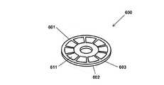 図16は、例えば回路基板材料から形成されたリング形状のディスクを備え、ディスクが、第1の表面601と、反対側の第2の表面602と、円周方向の縁部表面603とを有する、回転センサ部材600を示す。例えばめっきによって、第1の表面上にはコードトラックが形成され、第2の表面上には接地トラックが形成される(図示なし)。コードトラックは、本質的に、複数の円周方向で配置された個別の円弧状の接点区域611を備える、図5および14Aに示されるコードトラックに対応し、接地トラックは、本質的に、図5に示される円周方向の接地トラックに対応する。2つの表面に2つのトラックを配置することによって、より小さい直径のコードディスクを実現することができる。あるいは、接地トラックは縁部表面603上に配置されてもよい。  FIG. 16 comprises a ring-shaped disc, for example formed from circuit board material, the disc having a
