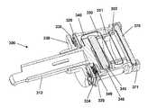 図示される実施形態では、2つの隣接した外側接点セグメント間のギャップは、ドーム状の接点が、一方のセグメントから次のセグメントへと移動する際に両方のセグメントと接触するように寸法決めされ、このことについてはより詳細に後述する。第2の回転センサ部は、回転センサホルダ339上の突起337を係合してそれらの間の回転移動を防ぐように適合された把持部336をさらに備える。  In the illustrated embodiment, the gap between two adjacent outer contact segments is sized such that the dome-shaped contact contacts both segments as it moves from one segment to the next. This will be described in more detail later. The second rotation sensor part further comprises a