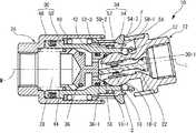 施錠子拘束部材34は、雌型継手本体30の内側本体部50の外周面50−1上で摺動可能に配置された筒状の内側スリーブ52と、内側スリーブ52の外周面52−1上に配置され、外側本体部48の内周面48−1と摺動可能に配置された筒状の外側スリーブ54とからなっている。主スプリング40は外側スリーブ54に係合して外側スリーブ54を前方(図で見て右方)に向かって付勢し、補助スプリング42は内側スリーブ52に係合して内側スリーブ52を前方に向かって付勢している。内側スリーブ52の外周面52−1には内側テーパー面52−2が形成され、また外側スリーブ54の内周面54−1には内側スリーブ52の内側テーパー面52−2に当接する外側テーパー面54−2が形成されていて、内側スリーブ52の前方への変位を制限している。すなわち、図1の連結状態から内側スリーブ52がさらに前方に変位することを制限するとともに、外側スリーブ54が後方(図で見て左方)に変位したときには内側スリーブ52も一緒に後方に変位するようになっている。  The