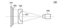 図1は、本発明のレンズの欠陥の検査方法を実施するために使用される撮像光学系100を示す図である。撮像光学系100は、照明装置101と、表面に縞パターンが形成された板103と、補正レンズ(ヌルレンズ)105と、検査対象レンズ107と、撮像装置109と、を含む。補正レンズ105は検査対象レンズ107による画像の歪曲を補正する目的で使用される。補正レンズ105、検査対象レンズ107、及び撮像装置109は、これらの中心が板103の縞パターンが形成された表面に垂直な直線上に位置するように配置される。上記の直線を光軸と呼称し、図1において一点鎖線で示す。撮像光学系100は、板103の縞パターンの光軸に垂直な方向の画像を、補正レンズ105と検査対象レンズ107との組合せを通して採取するように構成されている。なお、補正レンズ105及び検査対象レンズ107は逆向きに、すなわち検査対象レンズ107の凸の面が撮像装置109に向くように配置してもよい。  FIG. 1 is a view showing an imaging