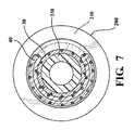 ステントグラフト10を図3に示す構成で取り付け、次にステントグラフト10を、図4〜8に示すようにコア部材300上へと略半径方向に圧縮し、シース200によって送達形態に保持する。図7の(図5の7―7で示す平面に沿う)断面図に最もよく示されているように、第二の脚40は、第三の部分330の外周の一部に沿って圧縮され、他方、第一の脚30は圧縮され、第三の部分330に対して略同軸に整列する。  The