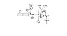 続いて、時刻T11のタイミングでスイッチSW2をオンさせると、電圧検出器DETの反転入力部がタッチ検出電極E2の電圧V0となり、その後、タッチ検出電極E2の静電容量Cx1(またはCx1+Cx2)と電圧検出器DET内の容量C5の時定数に従って電圧検出器DETの反転入力部は基準電圧Vrefまで低下する。このとき、タッチ検出電極E2の静電容量Cx1(またはCx1+Cx2)に蓄積されていた電荷が電圧検出器DET内の容量C5に移動するため、電圧検出器DETの出力が上昇する(Vdet2)。電圧検出器DETの出力(Vdet2)は、タッチ検出電極E2に指等が近接していないときは、実線で示す波形V4となり、Vdet2=Cx1×V0/C5となる。指等の影響による容量が付加されたときは、点線で示す波形V5となり、Vdet2=(Cx1+Cx2)×V0/C5となる。Subsequently, when turning on the switch SW2 at timeT 11, the voltage the voltageV 0 next to the inverting input is a touch detection electrode E2 of the detector DET, then the capacitance of the touch detection electrode E2 Cx1 (or Cx1 + Cx2) The inverting input of the voltage detector DET falls to the reference voltage Vref according to the time constant of the capacitor C5 in the voltage detector DET. At this time, the charge accumulated in the electrostatic capacitance Cx1 (or Cx1 + Cx2) of the touch detection electrode E2 moves to the capacitance C5 in the voltage detector DET, and the output of the voltage detector DET rises (Vdet2). The output of the voltage detector DET (Vdet2) when the finger or the like to the touch detection electrode E2 is not close, the next waveformV 4 shown by a solid line, andVdet2 = Cx1 × V 0 / C5 . When the capacity due to the influence of such a finger is added, it becomes a waveformV 5 shown by a dotted line, the Vdet2 = (Cx1 + Cx2) × V 0 / C5.