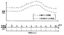 図6は、距離算出部70及び体表面間距離特定部80のそれぞれが逐次特定する種々の距離を、経時推移を概念的に表したグラフである。図6の上段は、距離算出部70の検出結果を表しており、下段は、体表面間距離特定部80が特定する体表面間距離の推移を表している。なお、図6の上段に示すグラフにおいて、一点鎖線は人体表面311までの距離の推移を表しており、二点鎖線は心臓320からの距離の推移を表している。また、便宜上、図6の下段のグラフは、心臓320の拍動に伴う体表面間距離の変位量を、上段に示す変位量よりも誇張して表している。  FIG. 6 is a graph conceptually showing the time course of various distances that are sequentially specified by the