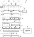 図3は、本発明の第二の側面に係る、面上を移動する物体の自己運動を推定するための装置1の他の一実施の形態を示す。図3の実施の形態において、装置1は、4台のサラウンドビューシステムの搭載カメラ2−1、2−2、2−3、2−4を備える。移動物体の近くの面を観測する搭載ビデオカメラ2−iの数は、変更されてもよい。移動物体の近くの面又は路面を観測するカメラとして、キャリブレーションカメラが適している。図3に示す実施の形態において、搭載ビデオカメラは、図3に示すように、対応するスイッチ6−1、6−2、6−3、6−4によって、カメラキャリブレーション部8に接続可能な上面視変換部7に接続可能である。各搭載ビデオカメラ2−iは、上面視画像の一部分を生成する。それらの部分間の重複部分は、不要である。したがって、最も画像分解能の高い領域を選択できる。各上面視部分は、面又は路面のグローバルグリッドと位置合わせされる必要がある。一実施の形態において、i番目の上面視部分Piの(n,m)番目の画素は、面又は路面上のある三次元点に対応する: FIG. 3 shows another embodiment of the
