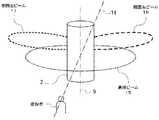 図1は、多数の入力オーディオチャンネル内にあるサウンドプログラムコンテンツを再生するために使用されているビーム形成ラウドスピーカアレイを有するオーディオシステムのブロック図である。ラウドスピーカキャビネット2(エンクロージャとも呼ばれる)は、多数のラウドスピーカドライバ3を内蔵している(少なくとも3つ以上、大半の事例では、入力オーディオチャンネルの数よりも多い)。一実施形態では、キャビネット2は、例えば、図2Aに示されるように、また図5の上面図に示されるように、略円筒形の形状を有してもよく、ドライバ3は、中心垂直軸9の周りに周方向に並べて配置されている。ドライバ3に関して、他の配置も可能である。更に、キャビネット2は、ドライバ3が実質的に球体の表面全体に均一に分布され得る略球状又は略楕円体形状などの他の一般的形状を有することができる。ドライバ3は、電気力学的ドライバであってもよく、例えば、ツィータ及びミッドレンジドライバの任意の好適な組み合わせを含む、異なる周波数帯域用に特別に設計されたいくつかを含んでもよい。  FIG. 1 is a block diagram of an audio system having a beam-forming loudspeaker array that is used to play sound program content within multiple input audio channels. The loudspeaker cabinet 2 (also referred to as an enclosure) contains a large number of loudspeaker drivers 3 (at least three, in most cases more than the number of input audio channels). In one embodiment, the