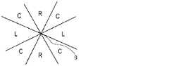図3A及び図3Bに示されている高次中央側モードは、図3Cに示されている組み合わせ又は重ね合わせのサウンドビームパターンを生成し、隣接する4つのステレオセクタ(水平平面内の中心垂直軸9の周りに360度にわたっている)が存在する。各ステレオセクタは、上述したように、左チャンネル領域Lと右チャンネル領域Rとに挟まれた中央領域Cから構成されている。図2Bと同様に、隣接するセクタ間に重複があり、L領域は、R領域と同様に2つの隣接するステレオセクタに共有される。したがって、図3Cには、各々L領域とR領域とに挟まれた隣接する4つの中央領域Cに対応する4つのセクタがある。 3A and 3B generates the combined or superimposed sound beam pattern shown in FIG. 3C, and produces four adjacent stereo sectors (center vertical axis in the horizontal plane). 9 around 360 degrees). Each stereo sector is composed of a central region C sandwiched between the left channel region L and the right channel region R as described above. Similar to FIG. 2B, there is an overlap between adjacent sectors, and the L region is shared by two adjacent stereo sectors as in the R region. Accordingly, in FIG. 3C, there are four sectors corresponding to four adjacent central regions C sandwiched between the L region and the R region, respectively.