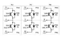 また、パワー半導体モジュール1には、三相インバータ回路のW相PWの上アームPWUの一部を構成する正極端子P3(11)と、下アームPWLの一部を構成する負極端子N3(12)とが設けられている。更に、W相PWの一部を構成する交流端子W(13)と、上アームPWUの一部を構成するゲート電極端子GWUと、下アームPWLの一部を構成するゲート電極端子GWLとが設けられている。なお、W相PWにおいては、正極端子P3(11)、負極端子N3(12)及び交流端子W(13)が外部導出端子部10を構成している。  Further, the power semiconductor module 1 includes a positive terminal P3 (11) constituting a part of the upper arm PWU of the W-phase PW of the three-phase inverter circuit and a negative terminal N3 (12) constituting a part of the lower arm PWL. And are provided. Furthermore, an AC terminal W (13) constituting a part of the W-phase PW, a gate electrode terminal GWU constituting a part of the upper arm PWU, and a gate electrode terminal GWL constituting a part of the lower arm PWL are provided. It has been. In the W phase PW, the positive terminal P3 (11), the negative terminal N3 (12), and the AC terminal W (13) constitute the external lead-out
