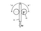 屈曲試験は、図3に示すように、被試験体であるケーブル40(長さ70cm)の下端に荷重W=5N(500gf)の錘を吊り下げ、ケーブル40の左右に湾曲した形の曲げジグ43を取り付けた状態で、曲げジグ43に沿って左右方向に向けて屈曲角X=±90°の曲げを加えるようにケーブル40を動かすことで行う。屈曲R(曲げ半径)について同軸ケーブルは19mm、多心ケーブルは25mmとした。屈曲速度は30回/分とし、屈曲回数は左右方向への1往復を1回としてカウントした。そして、屈曲を繰り返しながら、ケーブル40の両端から編組シールド層に常時数Vの電圧を加え、電流値が試験開始時に比べて20%低下した時点を断線とみなした。  As shown in FIG. 3, the bending test is a bending jig in which a weight with a load W = 5N (500 gf) is suspended from the lower end of a cable 40 (70 cm in length), and the