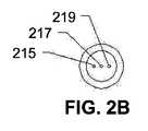 図2Aおよび2Bは、本開示の例示的態様に従う、空気を通過させない中空繊維フィルター201についての同様の構造を示す。図2Aは、開口205、繊維フィルター201、透過パージ207および透過ドロー209を含むCPT200を示す。この構造において、繊維フィルター201は、上側疎水性通気部分211を有し、下側は親水性部分201である。親水性フィルターは、水を容易に通すが、細孔径が小さくなると、いったん濡れると、再び乾燥するまで空気を容易に通さない。疎水性通気部分211を加えることにより、親水性中空繊維201の全体が液体サンプルで満たされそれを通過させることができるまでは、空気は通気部を通過することができる。この利点に加えて、疎水性通気部分211を用いると、繊維フィルター201を空気で満たして流れを止めることなく、操作が開始された後、空気をCPT200に導入させることができる。疎水性通気部分211は、空気を通過させ、液体を繊維フィルター201に再び引き込む。接続部分213は、CPT200の操作のために、CPT200を濃縮ユニットに接続させる。接続部分213の中に、三つのポートが含まれる。図2Bは三つのポートを示し、透過パージ207に接続された第一ポート215、繊維フィルター201に接続された第二ポート217および透過ドロー209に接続された第三ポート219が含まれる。図2に示されるCPT200の残りは、構造が、図1Aおよび1Bに示すものと同じである。操作のために、CPT200は濃縮ユニットに接続され、流体が入口205に吸引され、繊維フィルター201の多孔質表面を通過する。サンプルの全体積が入口205を通過すると、捕捉粒子は、既知の体積の溶出緩衝液または湿潤泡状物を用いた繊維フィルター201の接線方向洗い流しにより溶出される。あるいは、液体の逆洗い流しを用いて良く、液体、泡状物または気体により二回目の接線方向一掃が成される。  2A and 2B show a similar structure for a