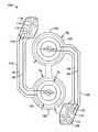図16は、第1の電極パッド102と第2の電極バッド104を有する層構成のSEMスキャナ電極システム100の好ましい実施例を示す。パッド104は曲線状の経路112に沿った配線34を介してリードライン入力116に接続されている。パッド102は曲線状の経路106に沿った配線34を介してリードライン入力110に接続されている。補剛部材層(例えば図5の層126)がリード入力110および116(痕跡108および114をそれぞれ参照されたい)の直下およびパッド102および104(痕跡122および120をそれぞれ参照されたい)の下に設けられる。  FIG. 16 illustrates a preferred embodiment of a layered SEM