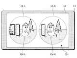 図5に示すように、表示部12のうち、貫通孔92Lを介して視認可能な左眼用視認領域12-Lには、仮想カメラCM-Lによる撮像結果、例えば、仮想カメラCM-LによりキャラクタVを撮像した結果であるキャラクタ画像GV-Lが表示される。また、表示部12のうち、貫通孔92Rを介して視認可能な右眼用視認領域12-Rには、仮想カメラCM-Rによる撮像結果、例えば、仮想カメラCM-RによりキャラクタVを撮像した結果であるキャラクタ画像GV-Rが表示される。
