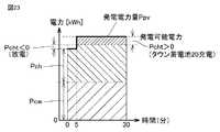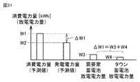 再び図21〜図23を参照して、垂下特性を用いたタウン蓄電池用電力変換装置21の動作を説明する。図21には、30分周期で需要家宅18及びタウン蓄電池用電力変換装置21に通知される運転計画(W3,W4)、並びに、当該運転計画の元となった、太陽電池1の発電電力量(W2)及び負荷5の消費電力量(W1)の予測結果が示されている。 With reference to FIGS. 21 to 23 again, the operation of the townbattery power converter 21 using the drooping characteristic will be described. In FIG. 21, the operation plan (W3, W4) notified to the customer'shouse 18 and thepower storage device 21 for the town storage battery at a cycle of 30 minutes, and the generated electric energy of thesolar cell 1 that is the basis of the operation plan. The prediction results of (W2) and the power consumption (W1) of theload 5 are shown.