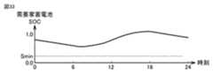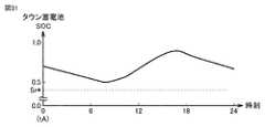 再び図34を参照して、CEMS15は、S155では、上記発電電力量の予測値(スマートタウン内の全ての需要家宅18内の太陽電池1の発電電電力の合計)、及び、負荷5の消費電力予測結果(スマートタウン内の全ての需要家宅18内の負荷5の消費電力の合計)から余剰電力を推定する。そして、タウン蓄電池充放電電力決定回路1607(図5)により、余剰電力推定結果、タウン蓄電池20のSOC、及び、蓄電池3のSOCから、余剰電力をタウン蓄電池20及び蓄電池3に案分することによって、タウン蓄電池20の充放電電力目標値(30分単位で24時間分)が決定される。 Referring to FIG. 34 again, in S155,CEMS 15 predicts the amount of generated power (the sum of the generated power ofsolar cells 1 in allcustomer homes 18 in the smart town) and the consumption ofload 5. The surplus power is estimated from the power prediction result (the total power consumption of theloads 5 in all the customer houses 18 in the smart town). And by the town storage battery charge / discharge power determination circuit 1607 (FIG. 5), by dividing the surplus power into thetown storage battery 20 and thestorage battery 3 from the surplus power estimation result, the SOC of thetown storage battery 20, and the SOC of thestorage battery 3. The charging / discharging power target value (for 24 hours in units of 30 minutes) of thetown storage battery 20 is determined.