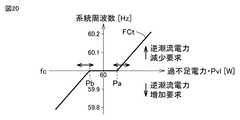 一方で、需要家宅18に送付された運転計画は変更されていないため、需要家宅18から配電系統への供給電力(売買電力)は変わらない。従って、タウン蓄電池用電力変換装置21は、需要家宅18から配電系統への供給電力が増加するまでは放電を継続する。しかしながら、タウン蓄電池20の充放電電力目標値が変わっているため、図20の横軸に示された過不足電力Pvlが発生する(Pvl<0)。本実施の形態では、タウン蓄電池用電力変換装置21の垂下特性は、例えば図21及び図22のケースでは、新たな運転計画値(充放電電力目標値)と、30分周期で作成した元もとの運転計画値(充放電電力目標値)との差分から、系統周波数が59.9(Hz)に設定されるように作成される。 On the other hand, since the operation plan sent to the customer'shouse 18 has not been changed, the power supplied from the customer'shouse 18 to the power distribution system (trading power) does not change. Therefore, the townbattery power converter 21 continues to discharge until the power supplied from the customer'shouse 18 to the power distribution system increases. However, since the charge / discharge power target value of thetown storage battery 20 has changed, the excess / deficiency power Pvl shown on the horizontal axis of FIG. 20 is generated (Pvl <0). In the present embodiment, the drooping characteristics of the townbattery power converter 21 are, for example, in the cases of FIGS. 21 and 22, the new operation plan value (charge / discharge power target value) and the source created at a 30-minute cycle. Is created so that the system frequency is set to 59.9 (Hz).