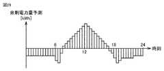 S186では、データベースに基づく理想的な発電電力に対する、実測した各種計測データを元に算出した発電電力の比(以下、発電電力推定用係数と記す)が算出される。具体的には、上述したように、需要家宅18内の蓄電池3の(放電電力(計画値)−充電電力実績(放電が正、かつ充電が負))と、(消費電力量(計画値)−消費電力量(実績値))の和が太陽電池1の発電電力予測誤差となるので、その際に、蓄電池3が最大充電電力(定格)で充電されてない場合には、天気予報に基づく元の太陽電池1の発電電力予測値に対して、上記太陽電池1の発電電力予測誤差を加算することによって、太陽電池1の発電電力推定値を算出することができる。 In S186, the ratio of the generated power calculated based on various measured data measured with respect to the ideal generated power based on the database (hereinafter referred to as a generated power estimation coefficient) is calculated. Specifically, as described above, (discharge power (planned value) −charged power record (discharge is positive and charge is negative)) of thestorage battery 3 in the customer'shouse 18 and (power consumption (planned value)) -The sum of the power consumption (actual value)) is the power generation power prediction error of thesolar battery 1, and in this case, if thestorage battery 3 is not charged with the maximum charge power (rated), it is based on the weather forecast By adding the generated power prediction error of thesolar cell 1 to the original generated power predicted value of thesolar cell 1, the generated power estimated value of thesolar cell 1 can be calculated.