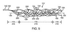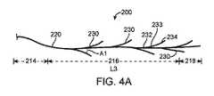 図4A−図4Cの延出要素230は、細長い中央部材220の長さL3に沿って交互に配置され、葉脈のように、それぞれの第1端部232が、第2端部234よりも近位側に配置されている。延出要素230は、図4A−図4Cに示すように、それぞれの第1端部232からそれぞれの第2端部234に延びる凹状の湾曲(例えば、正の単極性の凹状の滑らかな湾曲)をさらに含むことができる。延出要素230は、円形(図4D)、楕円形(図4E)またはその他の適切な断面形状を含むことができる。延出要素230の断面形状は、第1端部232から第2端部234まで連続的な形状であってもよく、あるいはその長さに沿って変化してもよいことを理解されたい。例えば、延出要素230の断面形状は、第1端部232および第2端部234において円形とし、中間部分233において楕円形とすることができる。  The