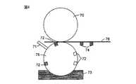 グラビア印刷は、印刷される画像が、ドラム上で回転する金属プレートに「エッチング」されることを必要とする。ドラムが回転すると、エッチングされた表面にインクが充填され、これは次に、インクを充填されたエッチングプレートとフィルムが互いに接触するとき印刷される、フィルムの表面上に堆積される。このプロセスは、図4で略図化されており、これはフィルム基材76が、インク槽73からのインクライン74で印刷されているのを示す。圧銅70は印刷ドラム75と接して回転し、これはインク槽73からのインクで充填されるエッチング72を有する。このようなプロセスは、後の処理のためのストック材料を作るために使用することができ、又は高容量センサの特定のX又はY構成要素を作製するために使用され得る。  Gravure printing requires that the image to be printed be “etched” into a metal plate that rotates on a drum. As the drum rotates, the etched surface is filled with ink, which is then deposited on the surface of the film that is printed when the ink-filled etching plate and film contact each other. This process is schematically illustrated in FIG. 4, which shows a