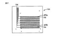 図7に表されるパターンは、本明細書において記載される方法の1つを使用して印刷されてもよく、単一印刷プロセス工程が使用されて、電極を形成する10μm未満の微小導電体、及び電極からコネクタパッドに信号を伝達する相互接続線(典型的には10μm超)を同時に印刷し、またコネクタパッド自体も同じ印刷プロセスで形成されてもよい。例えば、マイクロコンタクト印刷プロセスが使用されて、図27に関して記載されるように、3μmの微小導電体及び500μmの導電配線706のパターンを同時に印刷した。この特定の実施形態は、いくつかの利点をもたらした。  The pattern depicted in FIG. 7 may be printed using one of the methods described herein, and a single printing process step is used to form a microconductor less than 10 μm. And interconnect lines (typically greater than 10 μm) that transmit signals from the electrodes to the connector pads may be printed simultaneously, and the connector pads themselves may be formed in the same printing process. For example, a microcontact printing process was used to simultaneously print a pattern of 3 μm microconductor and 500 μm