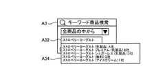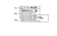 また、図5に示すように、領域A1の下側には、商品を検索するための検索エリアA3が設けられている。検索エリアA3には、商品のカテゴリを選ぶカテゴリ選択ウィンドウA31と、検索用のキーワードを入力するための入力欄A32とが設けられている。加えて検索エリアA3には、入力欄A32に入力したテキストを検索用のキーワードとして確定し、検索処理を開始するための検索ボタンA33が設けられている。 Further, as shown in FIG. 5, a search area A3 for searching for products is provided below the area A1. In the search area A3, a category selection window A31 for selecting a product category and an input field A32 for inputting a search keyword are provided. In addition, the search area A3 is provided with a search button A33 for confirming the text input in the input field A32 as a search keyword and starting the search process.