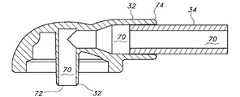 導管32は、図3、図5、図6、図8及び図9に概略的に示されているようなノズルの形態をとり得る。ノズルは、(器具の留置カテーテルによって画定された)ルーメンへ栄養溶液を供給するためにハブ40に画定されたオリフィス「O」に係合するように、コネクタの持ち上げ用タブ28の下面によって画定された平面を越えて延出するように構成されている。あるいは、導管32を、栄養溶液を供給するためにハブの上面から突出するノズル(図示せず)に係合させるように構成してもよい。  The