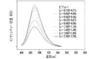 図2は、Li含量による青緑色蛍光体の実施例の発光特性を示した図である。 FIG. 2 is a graph showing the light emission characteristics of the example of the blue-green phosphor according to the Li content.