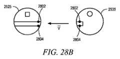 図22A,図22Bは、いくつかの実施形態による、図20のプロセスに従ってユーザ入力を受信する特定の詳細を表す説明図である。図22Aは、テレストレーション等のビデオマーカーツールを使用して、又は図4の制御入力装置160を操作する外科医コンソールを使用して形成することができる、生体組織等の標的410L,410Rの第1の強調表示領域2202L,2202Rの例を示す。図22Bは、ビデオマーカーツールを使用して形成することができる、器具チップ400L,400Rの第2の強調表示領域の2206L,2206Rの例を示す。いくつかの実施形態による動作では、ユーザは、第1の強調表示領域2202L,2202Rを形成する。次に、ユーザは、ビデオマーカーツールを使用して、器具チップ400L,400Rの第2の強調表示領域2206L,2206Rを形成する。項目が強調表示される順序は、重要でないことが理解されるだろう。次に、ユーザは、選択を入力するためにセレクタ(図示せず)を作動させる(例えば、ENTERキーを押す)。モジュール2002は、受信したユーザ入力を、標的画像410L,410R及び器具画像400L,400Rの選択として解釈する。  22A and 22B are illustrations depicting specific details of receiving user input in accordance with the process of FIG. 20, according to some embodiments. 22A shows a first view of a
