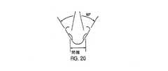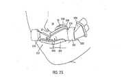 図5及び図6に示すように、ベース部分48の端部部分は、それに取り付けられたノズル50が互いに傾斜するように、互いに対して傾斜している。鼻翼角とも呼ばれるこの角度は、患者の様々な形状の鼻に対応するように調節することができる。例えば、図5及び図6に示す鼻用アセンブリ10は、実質的に平坦な鼻(図19参照)に対処するために、135〜155°、好ましくは約145°の範囲の鼻翼角を有する。別法として、鼻翼角は、尖ったまたは鋭い鼻(図20参照)に対処するために、70〜90°、好ましくは約80°の範囲であってもよい。しかし、鼻翼角は、何れかの形状の鼻にも対応するように何れかの適切な寸法を有してもよい。ノズルの運動は、より鋭い鼻に対応するのを助ける。  As shown in FIGS. 5 and 6, the end portions of the