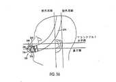 図13及び図14は、鼻用アセンブリ10の第1の対の取入導管74の上及び第2の対の取入導管76の一方の経路設定を概略的に示している。第1の対の導管74の第1の端部が、第2のコネクタ部分26の各導管72と接続される。第1の対の導管74の第2の端部が、第2の対の取入導管76の各第1の端部と接続される。第2の対の取入導管の第2の端部は、加圧された呼吸可能な気体を供給する加圧供給部と接続される。結果として、加圧された気体が、第1及び第2の対の取入導管74、76を通って枠16及びベース部分48内へ通過し、患者による呼吸のためにノズル50を通ることができる。図1に示すように、枠16は、枠16から外向きに僅かに突出する、CO2の流出のための一連の開口を備える排気口78を備える。  FIGS. 13 and 14 schematically illustrate the routing of one of the first pair of