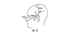 図13に概略的に示すように、第1及び第2の対の取入導管74、76は、患者の頭部を覆って上向きに延在するように経路が設定される。例えば、図13では、第1の対の取入導管74は、約120〜160mm、好ましくは約140mmの長さを有し、第2の対の取入導管76を、約160〜200mm、好ましくは約180mmの長さを有する。しかし、他の長さ寸法を同様に使用してもよい。図示した実施形態では、第1の対の取入導管74は、水平方向から約30°傾斜しており、第2の対の取入導管76は、水平方向から約90°傾斜している、すなわち第1の対の導管74から約60°傾斜している。しかし、第1及び第2の対の取入導管74、76は、何れかの適切な長さを有してもよく、患者の頭部を覆って上向きに延在する何れかの適切な方式で経路を設定してもよい。  As shown schematically in FIG. 13, the first and second pairs of
