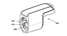 図9は、ほぼ円筒状のリング形状部分620を備えるモジュール主本体610のさらなる代替実施形態を示しているが、一体的に形成されたラッチを備える上述の実施形態とは対照的に、ラッチ構造はここでは、リング部分に取り付けられた別個の金属ラッチ部材621として提供されている。一体的に形成されたラッチに対応して、各ラッチ部材は、ペン型デバイスの対応する連結構造を係合するように適合された内側突起626を有する近位部分623、ならびにキャップがペン本体に装着されたときにキャップを係合するように適合された内側突起327を有する遠位部分624を備える。図示される実施形態では、金属ラッチ部材はそれぞれ、リベットによってリング部分に取り付けられる一対の近位側脚体を備える。金属ラッチの図示される実施形態は、特定のヒンジ構造を備えていないが、ペンに装着されたとき、ラッチ部材は、一体的に形成されたラッチと同じ「二重目的の」機能性を提供する。以下を参照のこと。図10は、円周方向停止面629を備え、金属ラッチ部材622を備えた、記録モジュール600に組み込まれた主本体610を示している。  FIG. 9 shows a further alternative embodiment of a module