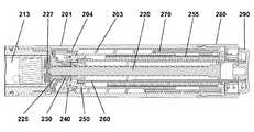 用量機構の中央部品はピストンロッド220であり、プランジャの実際の変位はピストンロッドによって行われる。用量送達の間、ピストンロッドは駆動要素230によって回転させられ、ハウジングに固定されたナット要素225とのねじ込み相互作用によって、ピストンロッドは遠位方向で前方に移動する。ゴム製ピストンとピストンロッドとの間には、回転するピストンロッドの軸方向軸受としての役割を果たすとともに、ゴム製ピストンに対する圧力を均一にする、ピストンワッシャー227が位置する。ピストンロッドは、ピストンロッド駆動要素がピストンロッドと係合する非円形断面を有するので、駆動要素はピストンロッドに回転係止されるが、ピストンロッド軸に沿って自由に移動する。結果として、駆動要素の回転によってピストンの前方への直線移動がもたらされる。駆動要素は、駆動要素が(押しボタン端部から見て)時計方向で回転するのを防ぐ、小さいラチェットアーム234を備える。駆動要素との係合により、ピストンロッドは結果として前方にのみ移動することができる。用量送達の間、駆動要素は反時計方向に回転し、ラチェットアーム235は、ラチェット歯205との係合による小さいクリック音を、例えば一単位のインスリンが吐出される毎に1クリック、ユーザに提供する。  The central part of the dose mechanism is the