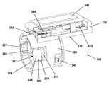 図6に移ると、内部の設計および構成要素を見せるために外部ハウジングが取り外されている、記録モジュール300の例示的な実施形態が示されている。モジュールは、電子回路構成の大部分が搭載されるシャーシをともに形成する、ほぼ円筒状のリング形状にされた部分320と本体部分330とを有する、主本体310を備える。主本体は、LDSポリマーから形成され、それにより、LDS(レーザーダイレクトストラクチャリング)技術を使用することによって統合された配線を達成することができ、ポリマーは、可撓性のヒンジ式ラッチが一体的に形成されることを可能にする弾性を有する。より具体的には、リング部分は、薬剤送達ペン本体に装着するように適合された内側のほぼ円筒状の表面、ならびにペン型デバイスの対応する連結構造を係合して、モジュールがしっかりと装着されることを確実にするように適合された、一対の対向する一体的に形成された連結構造321を備える。リング部分の遠位部は大きい直径を有し、モジュールがペンに装着されたときに、キャップを受け入れ係合するように適合された、遠位側に面する円周方向停止面329を備える。以下を参照のこと。  Turning to FIG. 6, an exemplary embodiment of a