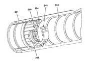 図4Aでは、クラッチ要素、駆動要素、およびハウジング(一部)が用量設定状態で示され、図4Bでは、同じ構成要素が吐出状態で示されている。明白なように、駆動要素がその上に配置されるピストンロッド、およびクラッチ要素がその上に装着されるラチェットチューブは示されていない。ハウジングの内表面に設けられた構造をより良好に示すため、図4Cは、ハウジング201内に配置された部分的なクラッチ要素240を示している。  In FIG. 4A, the clutch element, drive element, and housing (part) are shown in a dose setting state, and in FIG. As is evident, the piston rod on which the drive element is arranged and the ratchet tube on which the clutch element is mounted are not shown. FIG. 4C shows a partial