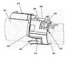内側リング表面および外側ペン本体表面は、形状嵌めまたはわずかな摩擦係合の状態であってもよい。モジュール上の各連結構造は、近位部分323、遠位部分324、および中央部分を有するラッチ322の形態であり、ラッチは、一体的に形成された可撓性ヒンジ325によってリング部分に枢動的に接続されて、ラッチが円周方向軸に対応して数度枢動できるようにしている。この構成によって、近位部分を外側に移動させると遠位側ラッチ部分は内側に移動し、その逆もまた真である。近位側ラッチ部分はそれぞれ、ペン型デバイスの対応する連結構造を係合するように適合された内側突起326を備え、遠位側ラッチ部分はそれぞれ、キャップをペン本体に装着したときにキャップを係合するように適合された突起327を備える。モジュールをペンに対して適正な回転方向で装着することを確実にするため、図示されるモジュールは、ペンの対応する突起を軸方向で係合するように適合された、漏斗状のスロット528(図8を参照)を備える。図1Aに図示される実施形態では、突起212はペンカートリッジホルダ210上に設けられ、ペン表示窓202とは反対側に配置され、電子ディスプレイ130はそれにより、モジュールがペンに装着されるとペン表示窓の隣に配置される。記録モジュール、ペン本体、およびキャップの間の相互作用については、さらに詳細に後述する。  The inner ring surface and the outer pen body surface may be in a form-fit or slight frictional engagement. Each coupling structure on the module is in the form of a