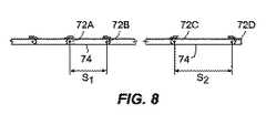 別の実施形態では、取り付け可能な物品は、第1および第2の縦方向側と、第1ならびに第2の縦方向端部間に延在する第1および第2の横方向側とを有する、略長方形形状の基板を含み、可撓性基板は、可撓性基板の曲げ運動を各次元における特定の最小曲げ半径に制限するようにともに動作する、それぞれ、基板の第1および第2の横方向側と第1および第2の縦方向側との間に延在する、複数の相互接続された部品を有する。取り付け可能な物品はまた、可撓性基板上に配置される可撓性電子ディスプレイを含んでもよく、可撓性電子ディスプレイは、可撓性電子ディスプレイが、可撓性電子ディスプレイの電子機能性を損なうことなく曲げられ得る、最小臨界曲げ半径を有する。そのような最小臨界曲げ半径は、それを越えると、1回または少数回の曲がりに応じて、可撓性ディスプレイの電子機能性が損なわれる曲げ半径であり得る(例えば、1回、2回、3回等、最小臨界曲げ半径を越えて可撓性ディスプレイを曲げると、機能性が損なわれる)、またはそれを越えると、有意な回数の曲げ運動に応じて、可撓性ディスプレイの電子機能性の信頼性がなくなる、もしくは損なわれ得る、曲げ半径であり得る(例えば、最小臨界曲げ半径は、電子ディスプレイが、損なわれずに、有意な回数確実に曲げられ得る、最大最小半径であり得る)。なおもさらに、電子機器モジュールは、可撓性電子ディスプレイに電子的に接続され、可撓性電子ディスプレイに結合されるディスプレイドライバと、ディスプレイドライバに結合されるプロセッサとを含む。この場合、基板の縦方向における可撓性基板の特定の最小曲げ半径は、基板の横方向における可撓性電子ディスプレイの最小臨界曲げ半径を上回るまたはそれに等しくてもよい。さらに、これらの曲げ半径は、ディスプレイまたは他の可撓性電子構成要素が凹面および凸面となるように曲げられるとき、各方向に沿って異なってもよい(または同一であってもよい)。 In another embodiment, an attachable article has first and second longitudinal sides and first and second lateral sides extending between the first and second longitudinal ends. , Including a substantially rectangular shaped substrate, wherein the flexible substrate operates together to limit the bending motion of the flexible substrate to a particular minimum bending radius in each dimension, respectively. It has a plurality of interconnected components extending between a lateral side and first and second longitudinal sides. The attachable article may also include a flexible electronic display disposed on the flexible substrate, wherein the flexible electronic display increases the electronic functionality of the flexible electronic display. It has a minimum critical bending radius that can be bent without loss. Such a minimum critical bending radius may be a bending radius beyond which the electronic functionality of the flexible display is compromised, depending on one or a few bends (eg, once, twice, Bending the flexible display beyond the minimum critical bend radius, such as three times, would impair functionality), or beyond that, the electronic functionality of the flexible display in response to a significant number of bending movements Can be unreliable or compromised (e.g., the minimum critical bend radius can be a maximum minimum radius that an electronic display can be reliably bent a significant number of times without being compromised). Still further, the electronics module includes a display driver electronically coupled to the flexible electronic display and coupled to the flexible electronic display, and a processor coupled to the display driver. In this case, the specific minimum bending radius of the flexible substrate in the longitudinal direction of the substrate may be greater than or equal to the minimum critical bending radius of the flexible electronic display in the lateral direction of the substrate. Further, these bending radii may be different (or may be the same) along each direction when the display or other flexible electronic component is bent to be concave and convex.