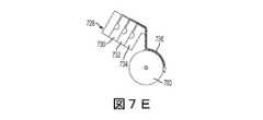 図7Eには、スライドカーテンコーティング技術が示されており、この技術では、流体源728が、第1の流体730、第2の流体732、および第3の流体734を含み、これらの流体により、多層構造の流体736が生成され、ローラ700の表面に付着する。第1の流体730、第2の流体732、および第3の流体734がそれぞれ供給されると互いに一つ流体に流れ込み多層構造の流体736が形成されるよう、流体源728は、ローラ700の側面にローラ700に対して一定の角度だけ、傾けられて配置される。流体源728はローラ700の表面から離れて配置されており、流体736をローラ700に塗布する際、ローラ700の表面とは物理的に接触せず、これにより、流体736は空気中を一定の距離だけ移動した後でローラ700と接触する。流体経路は、流体736とローラ700が接触する点と直交する方向に延在し、ローラ700の外周を覆う。  FIG. 7E illustrates a slide curtain coating technique in which a