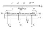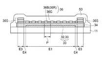 表示領域E1では、上述したように、カラーフィルター36のうちY方向に配列する着色層36Bと着色層36Rとに重なるようにストライプ状にOC層50が設けられている。画素Pは、OC層50が設けられた部分と、OC層50が設けられておらず隣り合う画素Pとの間で溝50aをなす部分とを含むことになる。すなわち、カラーフィルター36上の接着剤41と接する接着面に、X方向に配列する画素PごとにY方向に延在するストライプ状の凹凸としての溝50aが設けられている。なお、図5に示した、ストライプ状のOC層50及び溝50aの表示領域E1における数は、画素PのX方向に配列する数によって決まる。図5及び図6では視認可能な程度の数でストライプ状のOC層50及び溝50aを図示している。  In the display region E1, as described above, the