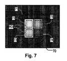 [0066]  図7は、図2の装置で図6のターゲットを使用し、XおよびYの両方の向きでオフアクシス照明を同時に行う従来の照明プロファイルを使用してセンサ23に形成し、センサ23によって検出することができる像の例を示している。暗色の長方形70は、センサ上の像のフィールドを表し、このフィールド内で、基板上の照明スポット61が、対応する円形領域71に結像されている。この円形領域71内の長方形領域72〜75は、小ターゲット格子62〜65の像を表している。格子が製品領域に配置される場合、製品フィーチャが、このイメージフィールドの周辺に見えることもある。イメージプロセッサおよびコントローラPUは、格子62〜65の分離した像72〜75を識別するために、パターン認識を使用してこれらの像を処理する。この方法では、像は、センサフレーム内の特定の位置にきわめて正確に合わせる必要はなく、これは、測定装置のスループットを全体として大きく向上させる。しかし、結像プロセスが、イメージフィールド全体にわたって不均一になりやすい場合に、依然として、正確に位置合わせする必要がある。本発明の一実施形態では、4つの位置P1〜P4が特定され、格子は、これらの既知の位置に出来るだけ合うようにされる。  FIG. 7 illustrates the use of the target of FIG. 6 in the apparatus of FIG. 2 and the formation of