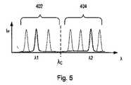 [0059]  図5は、2つの特定の波長が選択された場合の放射源11の例示的なスペクトル特性を示している。第1の放射源11−1は、第1の波長範囲402内の波長λ1を有する狭帯域放射を供給するように動作している。第2の放射源11−2は、第2の波長範囲404内の波長λ2を有する狭帯域放射を供給するように動作している。フィルタ300、310のセグメントの配置および図4に示すスペクトル特性を再度参照して、両方の波長の回折放射は、同時に検出してメトロロジ目的で使用することができ、一方、両方の波長のゼロ次放射は遮断される。したがって、より一般的には、フィルタ300は、前記収集光学系の瞳面の1つまたは複数の第1の部分にある第1の通過帯域と、瞳面の1つまたは複数の第2の部分にある第2の通過帯域とを有し、第1の部分は、第1の波長の放射を透過させるが、第2の波長の放射を遮断し、第2の部分は、第2の波長の放射を透過さるが、第1の波長の放射を遮断する。  FIG. 5 shows exemplary spectral characteristics of the radiation source 11 when two specific wavelengths are selected. The first radiation source 11-1 is operative to provide narrowband radiation having a wavelength λ1 within the